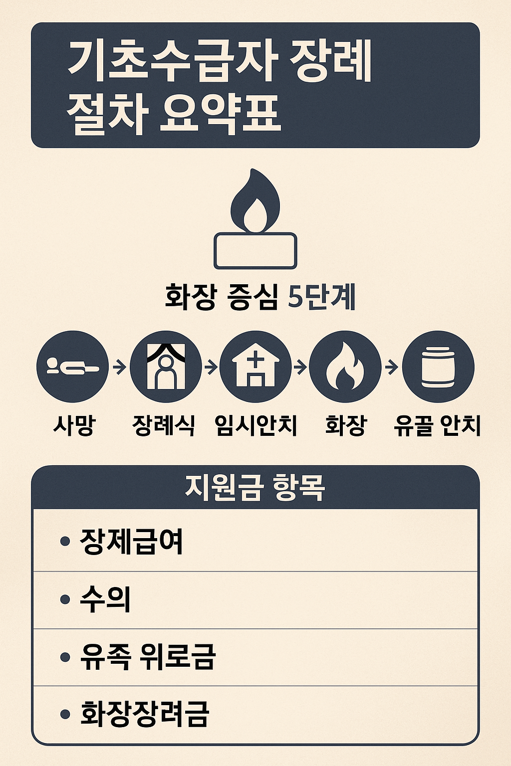 인포그래픽 제안: ‘기초수급자 장례 절차 요약표’ – 화장 중심 5단계 흐름 + 지원금 항목별 정리