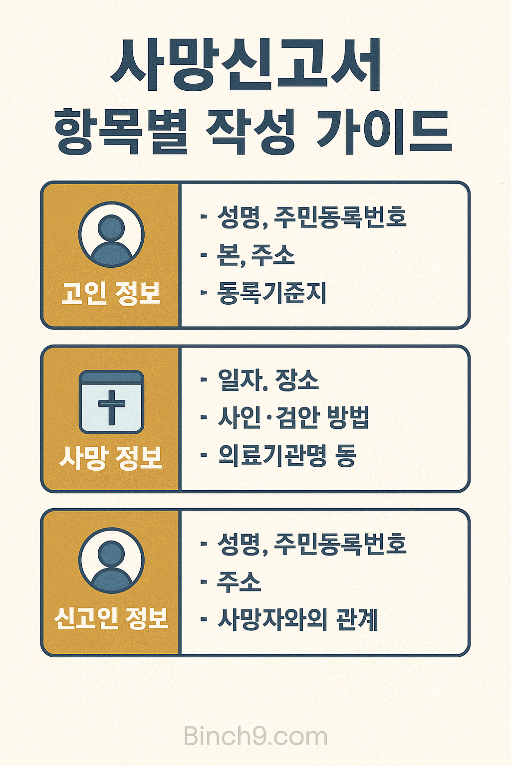 인포그래픽 제안: ‘사망신고서 항목별 작성 가이드’ – 고인 정보, 사망 정보, 신고인 정보로 나누어 시각 구성