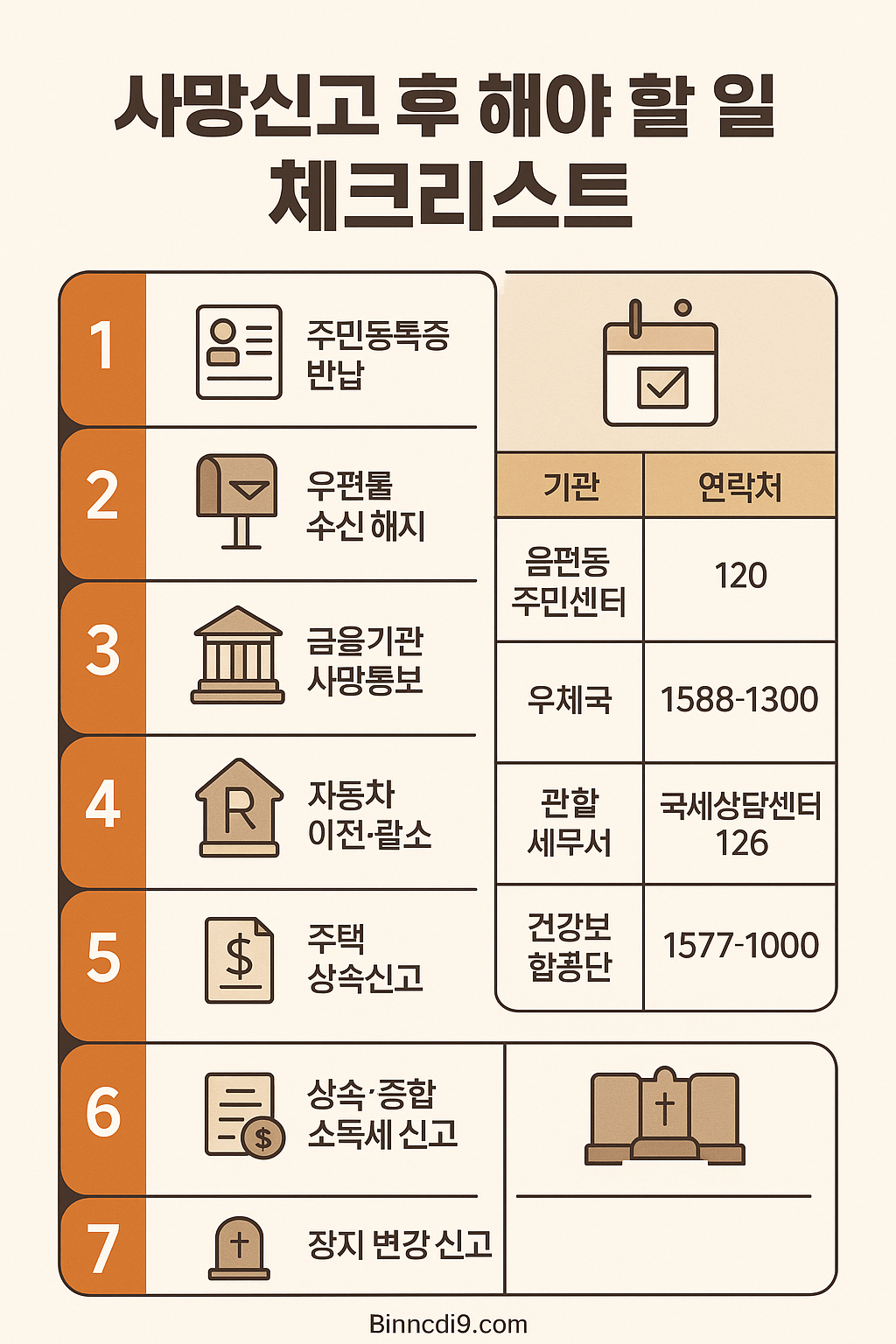 인포그래픽 제안: ‘사망신고 후 해야 할 일 체크리스트’ – 7단계 절차 흐름도 + 기관별 연락처 정리