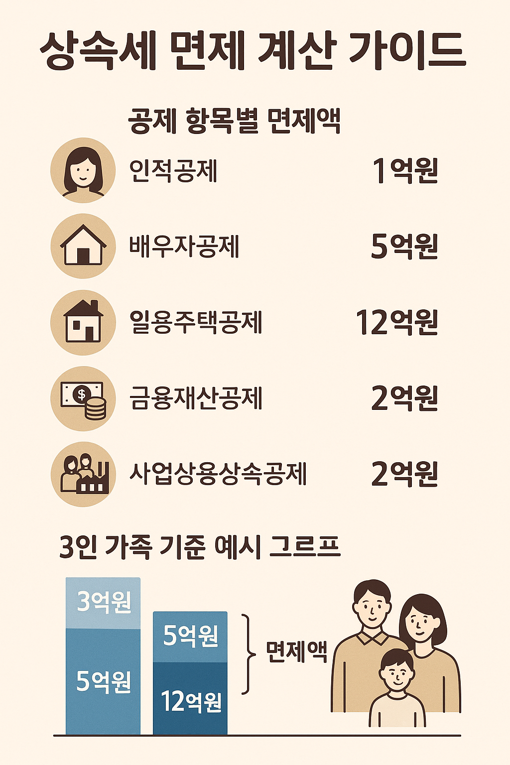 인포그래픽 제안: ‘상속세 면제 계산 가이드’ – 공제 항목별 면제액 시각화 + 3인 가족 기준 예시 그래프