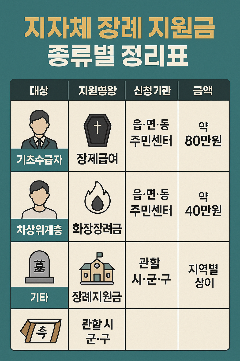 인포그래픽 제안: ‘지자체 장례 지원금 종류별 정리표’ – 대상별 지원 항목 + 신청기관 + 금액 요약